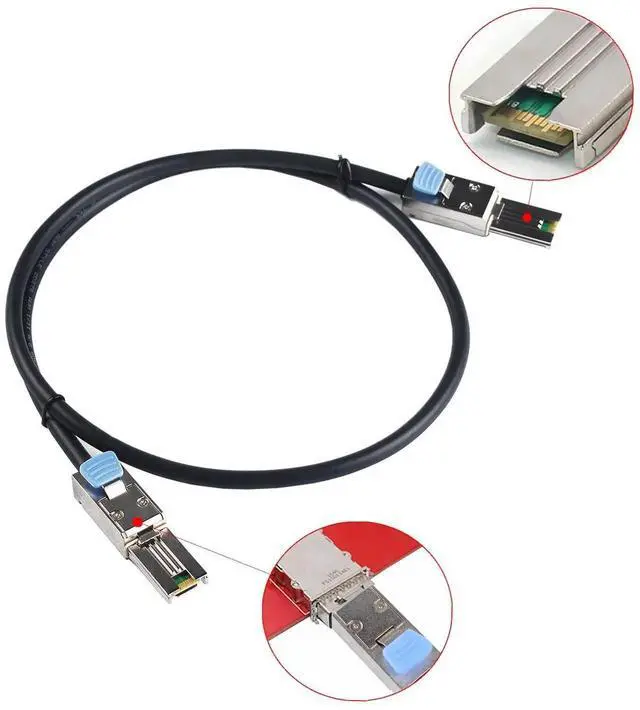 It has an external 26-pin SFF-8088 male Mini-SAS plug (with release ring) on Both ends