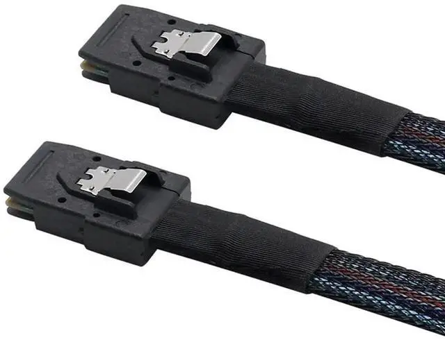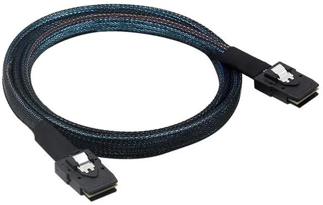 This long cable uses 30 AWG wires and is intended for internal use. It has a 36-pin SFF-8087 male Mini-SAS plug (with locking latch) on each end.