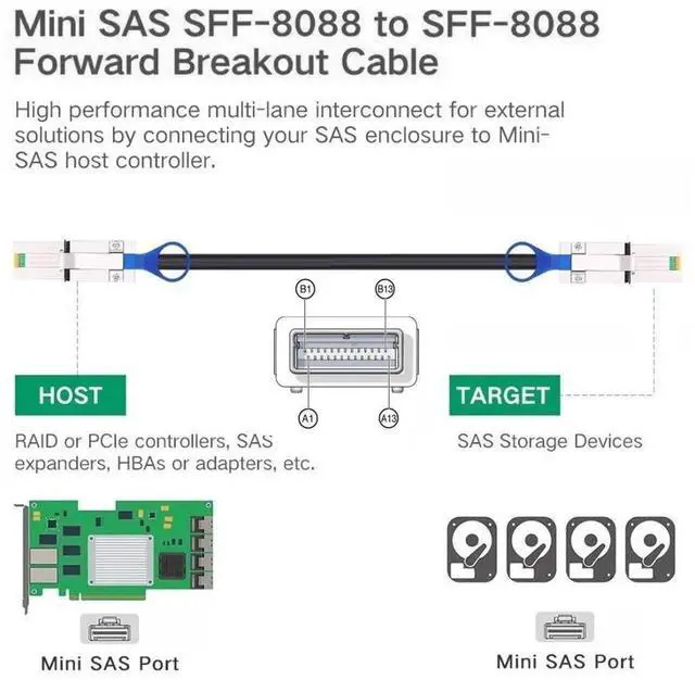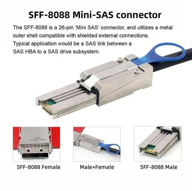 • External SAS Cable features "mini-SAS" SFF-8088 to SFF-8088 with heavy- duty metal backshells.