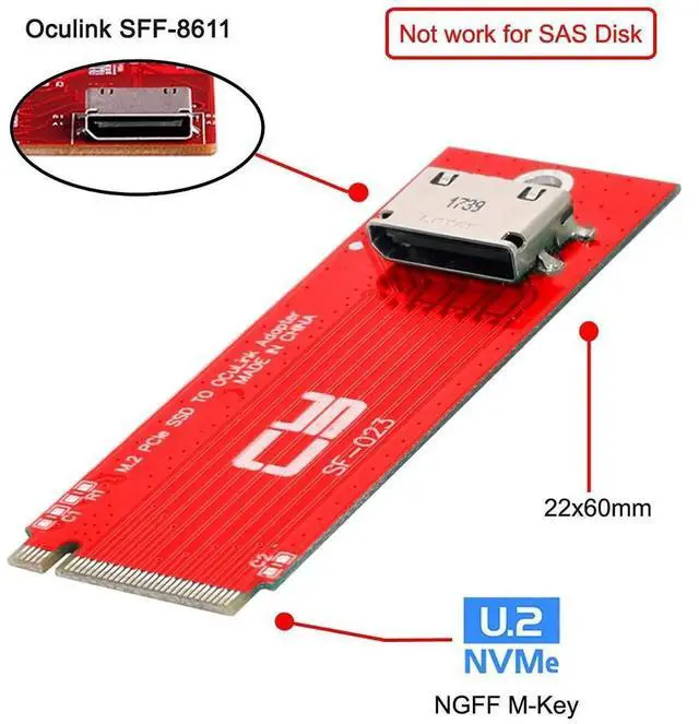 PCI-E 3.0 M.2 M-key to Oculink SFF-8612 SFF-8611 Host Adapter for PCIe Nvme SSD This convertor expands the system by one SFF-8612 interface. It can be connected e.g. one SSD by using an optional cable. The card transmits PCI Express signals using the NVMe protocol. Specification Connectors: 1 x OCuLink SFF-8612 female 1 x 67 pin M.2 Key M male Data transfer rate up to 32 Gbps Bootable, ex UEFI version 2.3.1 Supports NVM Express (NVMe) 1.2 System requirements Linux Kernel 4.3 or above Windows 8.1/8.1-64/10/10-64 A free M.2 interface with key M