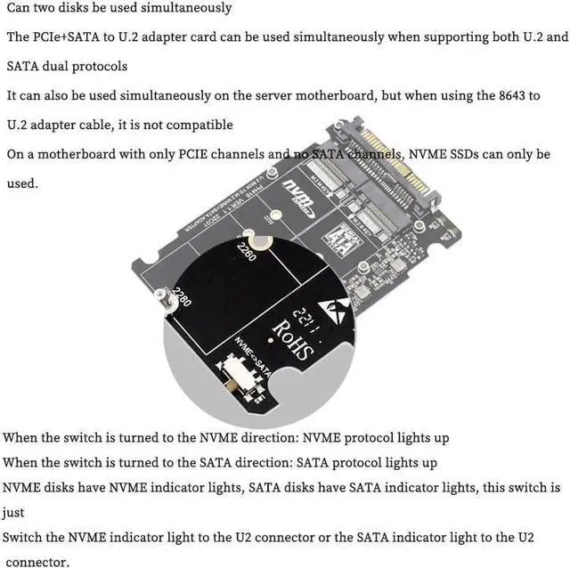 The PCIE+SATA to U. 2 adapter can be used at the same time, and it can be used on server motherboards that support U. 2 and SATA dual protocols, but only NVME SSDs can be used with 8643 to U. 2 adapter cables, and ordinary motherboards that only have a PCIE channel but not a SATA channel.