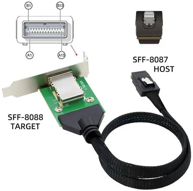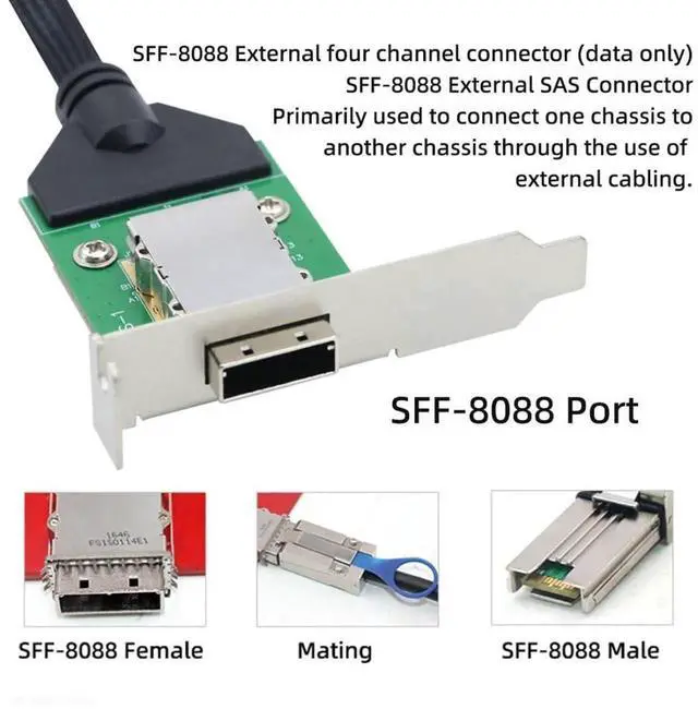 External SFF-8088 female to internal SFF-8087 male cable, will work both on the host and device side. With Low Profile bracket.