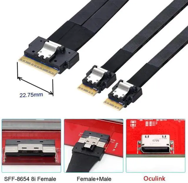 This cable can be used to connect internal devices, e.g. a backplane with Slim Line 8654 74pin connector to a controller with oculink SFF-8611 connector.