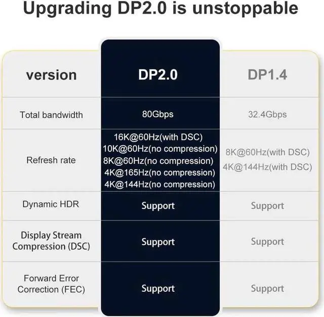 Upgarded 16K DisplayPort 2.0 /1.4/1.2/1.1 Cable Specification: