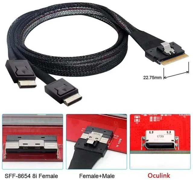 PCI-E Slimline SAS Slim 4.0 SFF-8654 8i 74pin to Dual Oculink SFF-8611 Cable 50cm PCI-Express This cable can be used to connect internal devices, e.g. a backplane with Slim Line 8654 74pin connector to a controller with oculink SFF-8611 connector. Ultraport Slimline 8i 74Pos Cable Assembly Length: 50cm