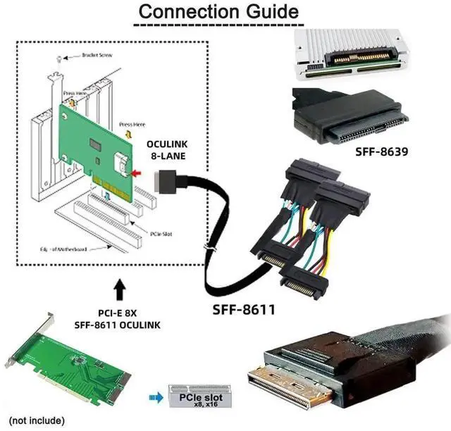 This OCuLink 8x cable can be used to connect internal devices, e.g. a backplane with SFF-8639 connector to a controller with OCuLink SFF-8611 8x connector.
