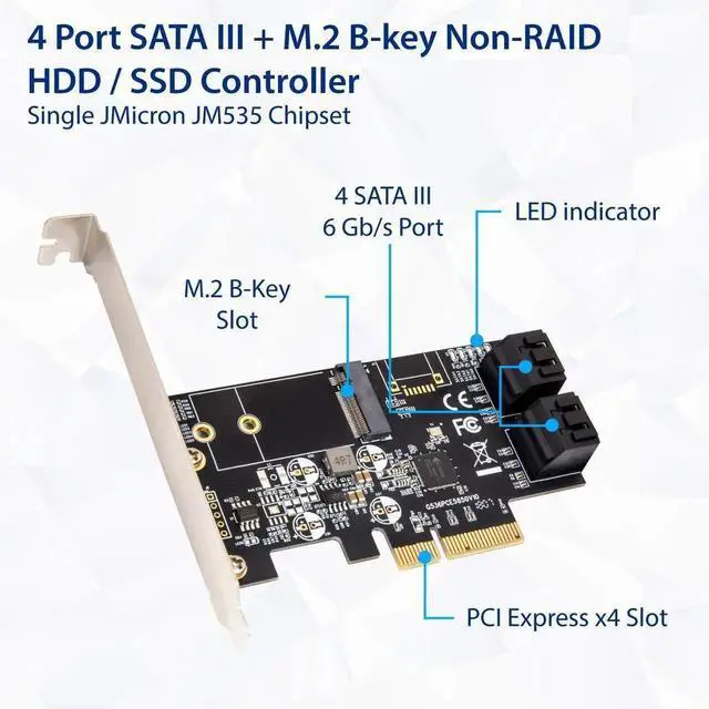 JAENFONG SI-PEX40138 Internal 4 Port Non-Raid SATA III 6GB/S with M.2 B-Key 22x42 Pci-E X4 Controller Card for Desktop PC Support SSD and HDD with Low Profile Bracket. JMB585 Chipset
