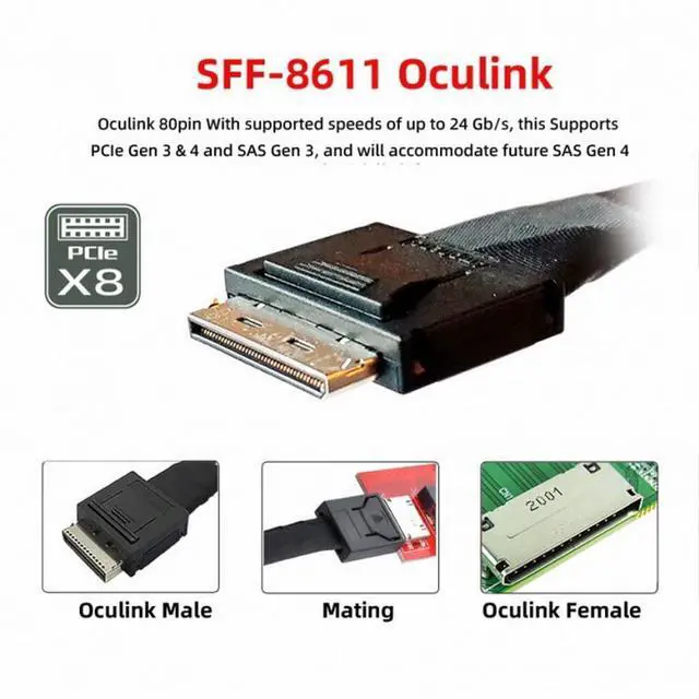 This OCuLink 8x cable can be used to connect internal devices, e.g. a backplane with SFF-8611 4x connector to a controller with OCuLink SFF-8611 8x connector.