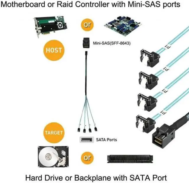 This SAS cable enables you to connect up to 4 SATA drives to a Mini SAS HD SFF-8643 controller.