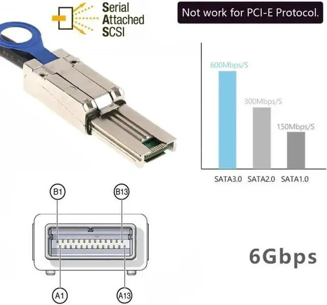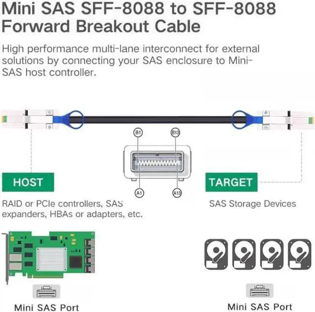 External SAS Cable features "mini-SAS" SFF-8088 to SFF-8088 with heavy- duty metal backshells.
