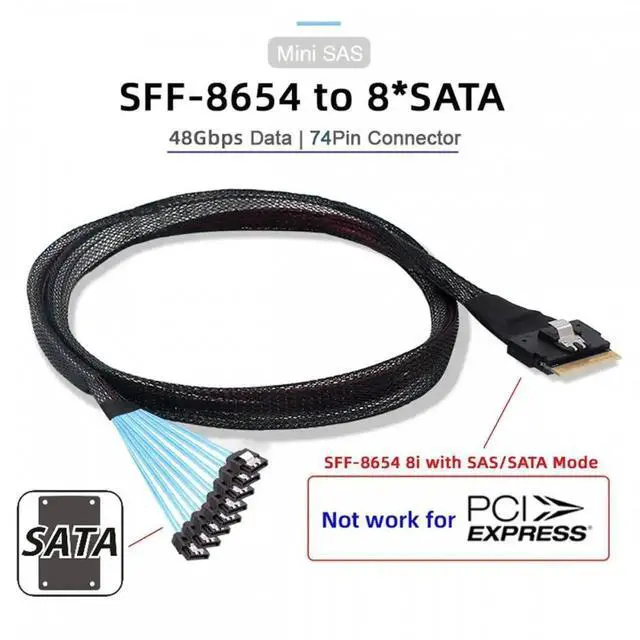 Slimline SAS 4.0 SFF-8654 8i 74pin Host Raid to 8 SATA 7pin Target Hard Disk Fanout Raid Cable 1-to-8