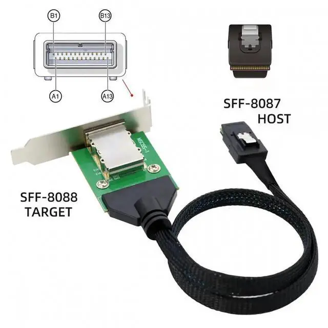 1. Internal Mini SAS SFF-8087 Male to External SFF-8088 Female Extension Cable PCBA With Low Profile Bracket