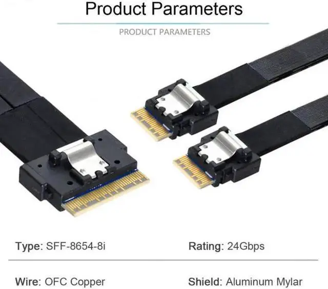 This cable can be used to connect internal devices, e.g. a backplane with Slim Line 8654 74pin connector to a controller with oculink SFF-8611 connector.