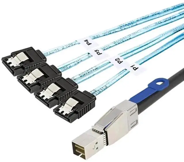 Mini SAS HD to 4 x SATA \u2013 Converts SFF-8644 with IC to four SATA 7-pin connectors, suitable for HDDs, SSDs, and enterprise storage applications.