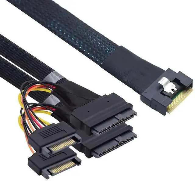 SFF-8654 to U.2 Conversion \u2013 Converts Slimline SFF-8654 8i to dual SFF-8639 U.2 + 15-pin connectors, compatible with modern SSD and storage systems.