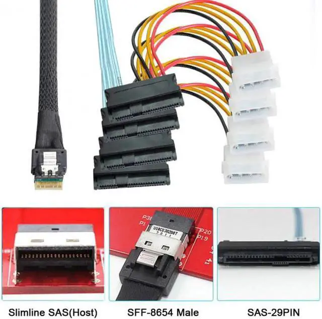 This SAS cable can be used to connect internal devices, e.g. a hard disk with SAS 29pin connector to a controller with Slim SAS SFF-8654 4i connector.