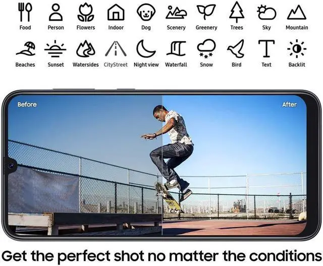When you have a million things to do, charging wont be one of them. Whether its a busy day or a big event, the Galaxy A50 all-day battery lasts up to 35 hours and if you need a boost, get up and running quickly with Fast Charge. 64GB of built-in memory means there's room for all your stuff, from contacts to apps and up to 100, 000 photos. Even expand your memory up to 512GB with a microSD card. Get the perfect shot every time with the Ultra Wide Camera and three specialized lenses that let you capture wider photos, shoot in low-light and take share-worthy selfies.
