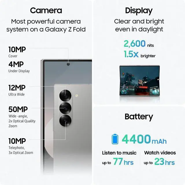 IMPRESSIVE GRAPHICS: Level up your screen and level up your gaming experience; Totally immerse yourself with Galaxy Z Fold6 thanks to a huge screen, a lightning-fast processor and incredibly realistic graphics