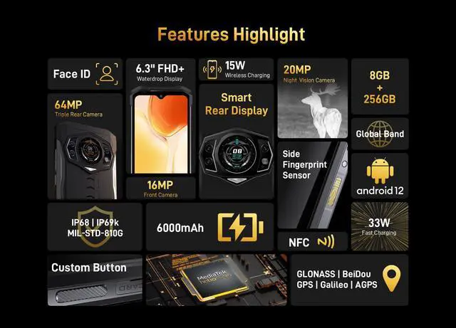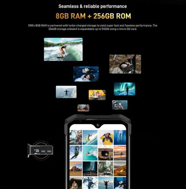 Dimensions: 172*82* 15.5 mm / 320g Helio G96 Octa Core + 8GB RAM 256GB ROM + Android 12 Under the hood, MediaTek Helio G96, armed with 2 powerful ARM Cortex A76 and 6 A55 cores which clocks at 2.05GH z, works to deliver high-level performance. Gaming and graphics-intensive performances are handled flawlessly by the Arm Mali-G57 GPU on board. 8GB RAM+256GB ROM S98's 8GB RAM is partnered with turbo-charged storage to yield super fast and flawless performance. The 256GB storage onboard is expandable up to 512GB using a micro SD card. Professional Laser Rangefinder Seize the opportunity to freeze amazing moments with one of the best camera sets on rugged phones. The 3 rear camera setups are a 64MP main camera, 20MP night vision sensor, and an 8MP wide-angle camera. 64MP pro-grade main camera The main camera is a massive 64MP sensor. Back by a solid Al, it takes pictures with great color definition resulting in a perfect picture for your memories. Eyes in the dark night Armed with a SONY 20MP night vision sensor and 2 infrared light sources, S98 gives you vision in the dark of night.
