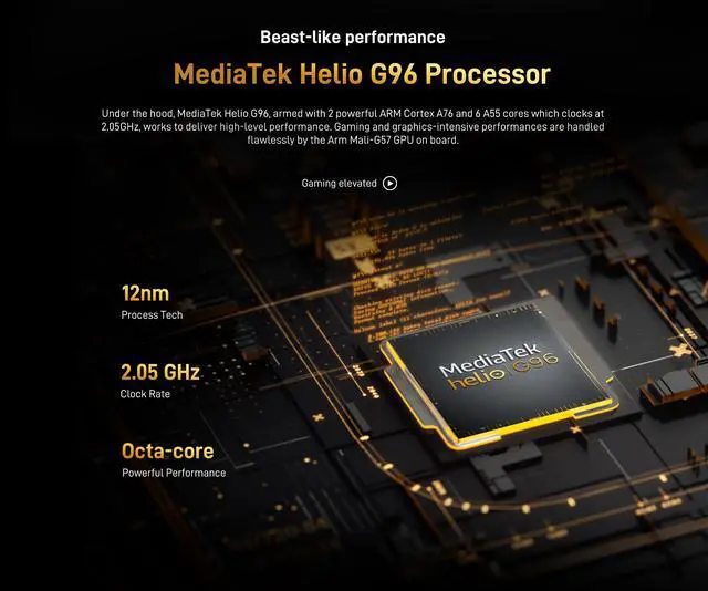 SupportedCPU: Helio G96 Octa Core 2.1GH z 12nm; 2 x Cortex A76 2.1GH z + 6 x Cortex A55 2.0GH z;