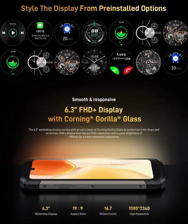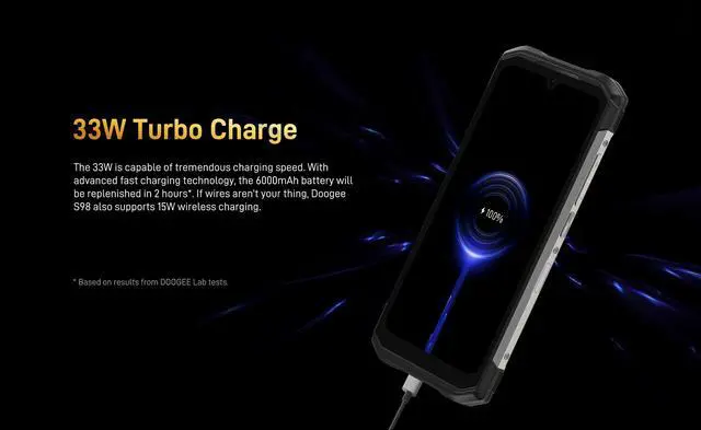 FOV 130°ultra-wide angle camera Capture 130° of data in one click, the 8MP wide-angle camera allowsyou to capture a wider perspective. 16MP Impressive selfie camera S98 comes with a 16MP SAMSUNG selfie camera for brighter and better portraits. Beauty mode will enhance your selfies to a level that is immediately Instagram-ready. 6.3" FHD+ Display with Corning Gorilla Glass The 6.3" waterdrop display comes with an extra layer of Corning Gorilla Glass as protection from drops and scratches. S98's display also has an FHD+ resolution with a peak brightness of480nits for a more immersive experience. Waterproof, Dustproof & Shockproof Ruddedly Built for Survivalists Having passed rigorous and demandinq standard tests such as IP68 /IP69K Grade tests, DOOGEE S98 has proven itself to be capable to handle any environment. It is not only resistant to splashes and drop but a bonafide MIL-STD-810G grade smartphone. Extreme Temperature Environment IP68/IP69K is built for intensive outdoor use and most harsh environment. It has been tested in all conditions and is resistant to damage from dropping, water emmersion, flushing and shock and impact.