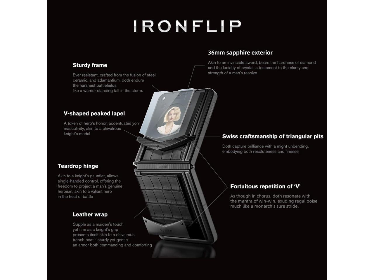 - SEAMLESS FOLDING The IRONFLIP phone integrates diamond-like water-drop hinges and Swiss-grade 316L steel bearings, withstanding 650,000 folds flawlessly while effortlessly hovering at fixed angles.