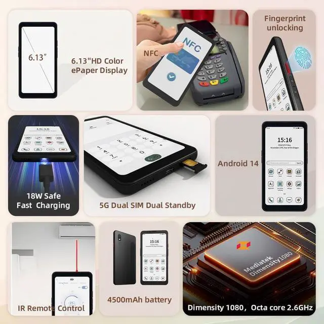 This innovative 5G smartphone combines a vibrant 6.13-inch color E-Ink display with the full capabilities of an advanced Android 14 device. Its unique screen delivers a comfortable, paper-like visual experience ideal for reading, reducing eye strain during extended use.