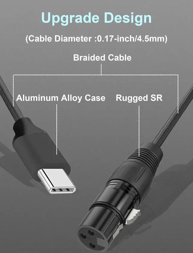 Low noise, high fidelity, TYPE-C microphone cable diameter 6mm (24AWG), oxygen-free copper (OFC) center conductor enhances signal transmission. High-quality one-piece TYPE-C interface and nickel-plated metal shell XLR connector, TYPE-C microphone cable uses PVC insulation material and high-density stranded copper shielding to reduce noise and achieve quiet operation.