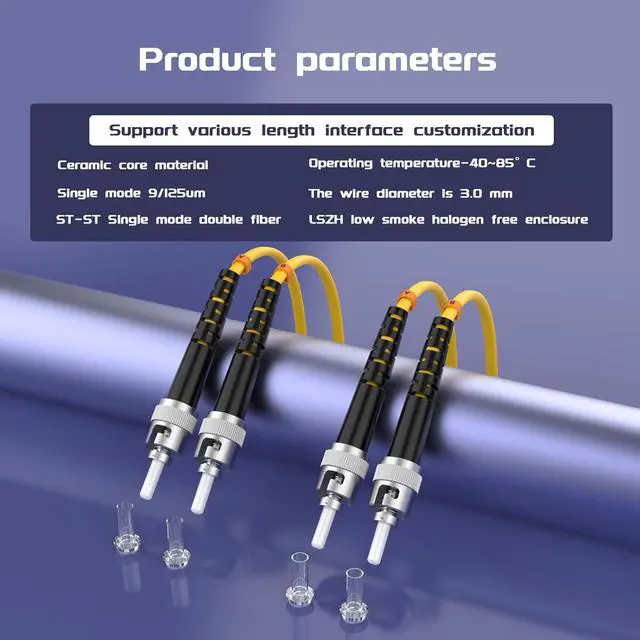 This 2.5Meters ST/UPC to ST/UPC singlemode OS2 fiber cable has an yellow color jacket with a 3.0mm diameter.It is flexiable and allowes a minimum installation bending radius of 5.0cm and a minimum long term bending radius of 3 cm.