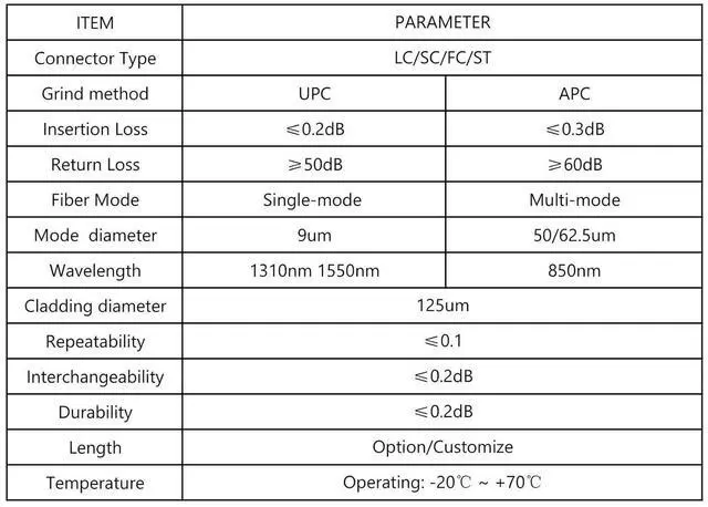 • Premium Ceramic Ferrule with high return loss of e"45dB and low insertion loss of d"0.3dB, providing precise alignment to ensure signal integrity. Interchangeability is d"0.18dB and vibration is d"0.2dB, resulting in low attenuation.