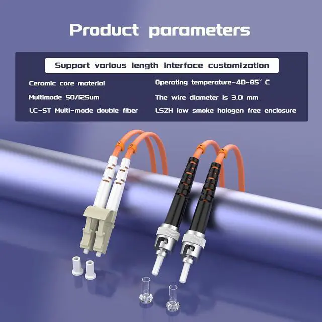This 3Meters LC/UPC to ST/UPC Multimode OM1 fiber cable has an Orange color jacket with a 3.0mm diameter.It is flexiable and allowes a minimum installation bending radius of 5.0cm and a minimum long term bending radius of 3 cm.