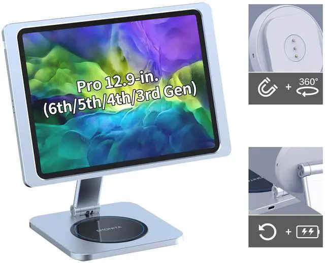 EMONITA foldable Magnetic Stand with Charging Case A10 for iPad Pro (6th / 5th / 4th / 3rd Generation) 12.9-Inch. Strong Magnets, 360 Rotation, 90 Tilt, 45W Fast Charger Adapter USB C Cable Included
