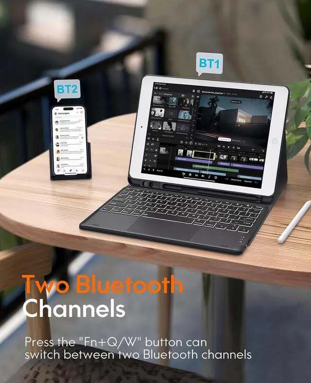 2 Bluetooth Channels & PENCIL HOLDER- Pair with up to 2 devices simultaneously and easily switch between them with only 1 click. Built-in Apple Pencil holder, cap & adapter slots, grab your Apple Pencil, easy to carry and use. Precise cutouts allow full access to all ports, sensors, speakers, microphones, and cameras.