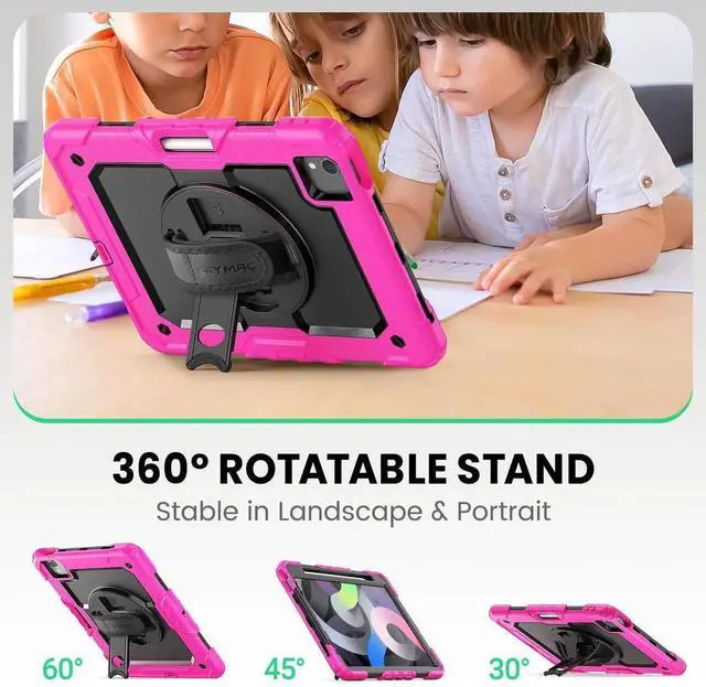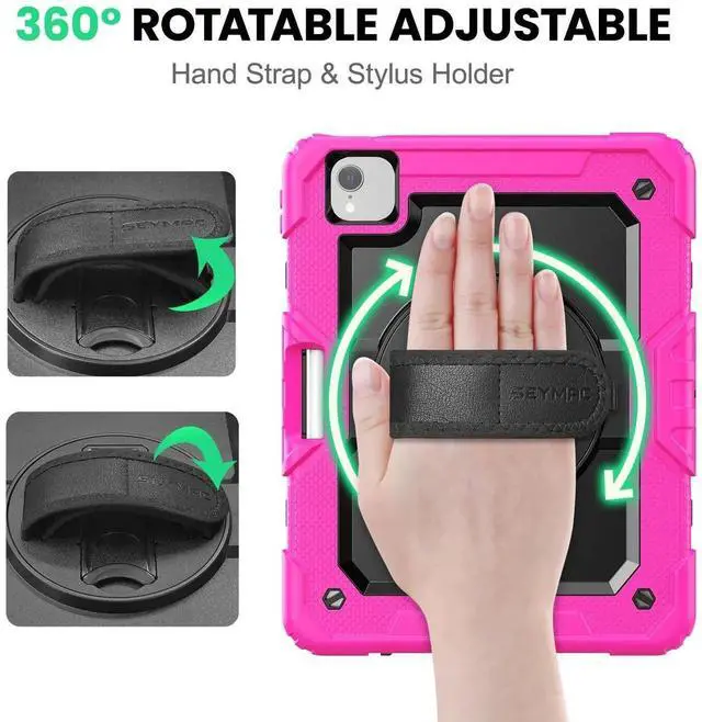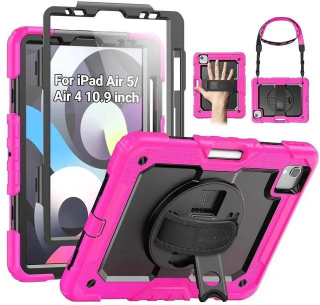SEYMAC Case for iPad Air 5th/ 4th Generation 10.9 Inch, Full-Body Shockproof Protective Case with Screen Protector, Rotating Stand/Handle/Shoulder Strap for iPad Air 5/ Air 4, Black/Pink