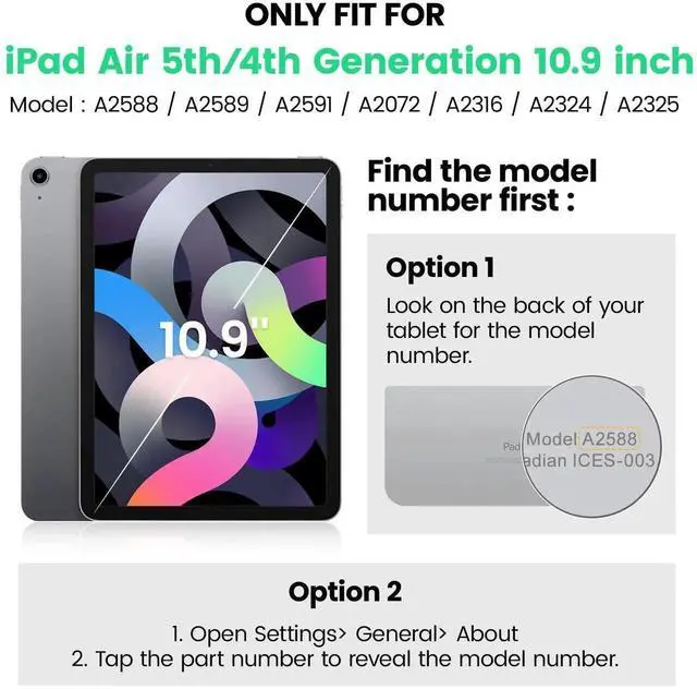 Compatibility: Only fits for iPad Air 5th/4th Generation 10.9 inch (Model: A2588 A2589 A2591 / A2072 A2316 A2324 A2325); not fit for iPad (A16) 11th/10th Generation; please check the model number on the back of your tablet (''Axxxx'') before purchase.
