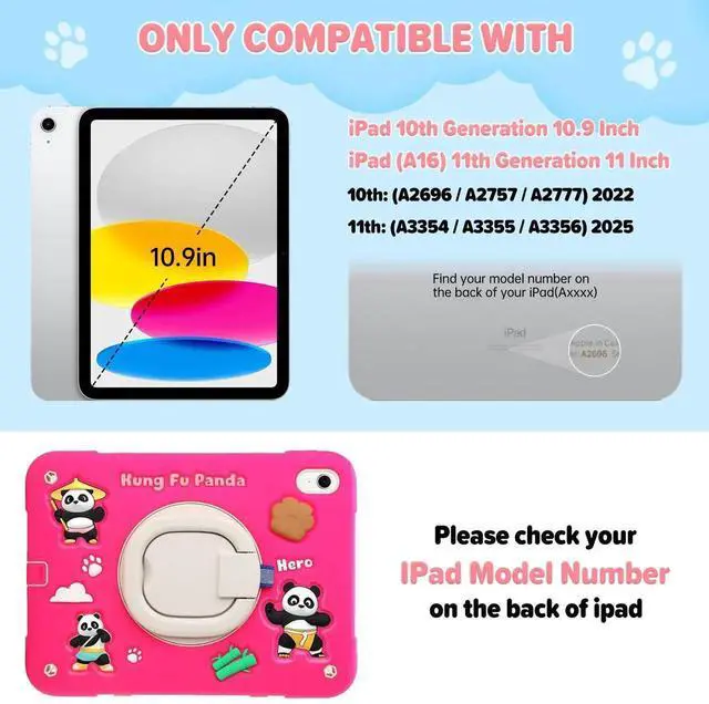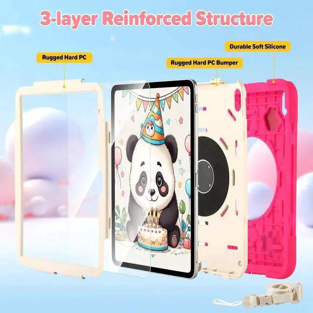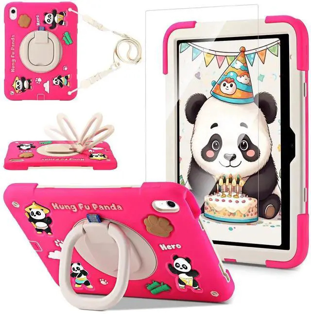 for iPad (A16) 11th Generation Case Kids, iPad 10th Generation with Screen Protector, Rugged Protective Cartoon 3D Panda Warrior Cover with Rotating Stand/Strap/Pen Slot for Kids Teens (Rose+White)
