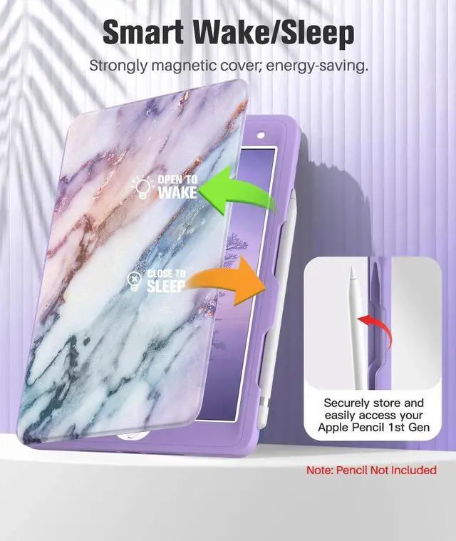 MoKo Case for iPad 9th Generation with Pencil Holder, iPad 8th/7th Gen Case 10.2 -inch, Built-in Screen Protector Clear Back, Stain Resistant Multi Angle Viewing Stand, Auto Wake/Sleep, Purple Marble