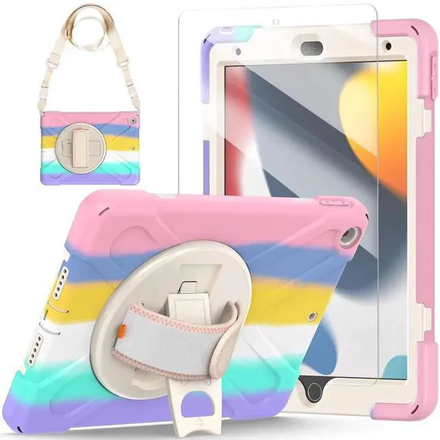 TSQ Case for iPad 9th 8th 7th Generation for Kids Girls Women with Screen Protector & Stand & Hand Strap 2021 2020 2019 ^^ Cute Rainbow Pink Cover Case for iPad 10.2 Inch