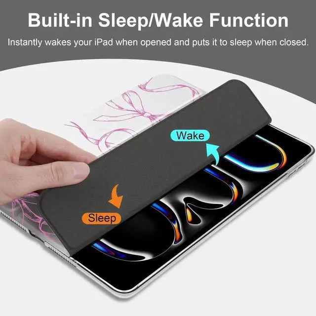 Magnetic protective cover automatically wakes iPad 10.2 when open and hibernates when closed to conserve power. Tri-fold stand provides the perfect viewing and typing angle