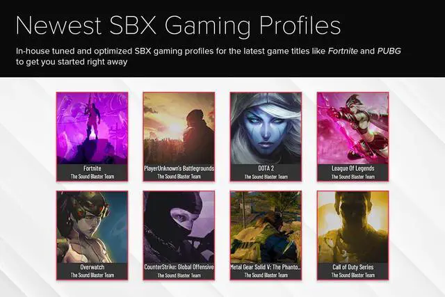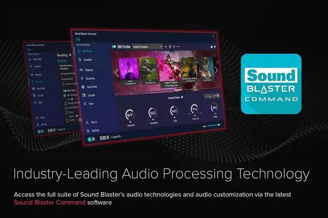 Sound Blaster Command Software Access the full suite of Sound Blasters industry-leading audio processing technologies including Crystallizer that helps improve the dynamic range of audio, or Bass that provides bigger punch on the low end. All enhancements are fully customizable from the Sound Blaster Command software suite on PC.