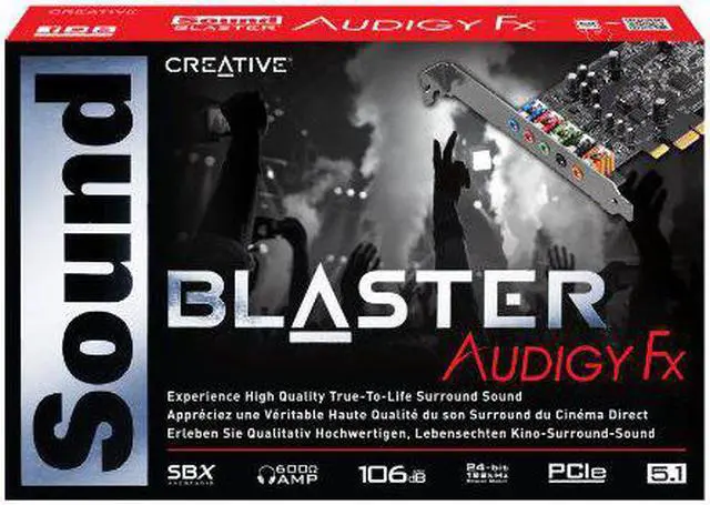Details: Meet the Sound Blaster Audigy Fx! This half-height sound card is powered by SBX Pro Studio Technology and instantly converts your system with 5.1 entertainment system that delivers cinematic surround sound - perfect for bringing out the best in your movies music and games. Users can look forward to full audio customization with Sound Blaster Audigy Fx Control Panel a downloadable PC software suite that allows users to control every aspect of SBX Pro Studio. The Audigy Fx further features 24-bit 192kHz digital-to-analog converter (Playback) 106dB SNR and a high-end 600 ohm headphone amplifier for studio grade monitoring. Minimum System Requirements: Intel Core 2 Duo or AMD equivalent processor 2.2GHz or faster recommended Intel AMD or 100% compatible motherboard Microsoft Windows 8 (32/64-bit) Windows 7 (32/64-bit) Windows Vista (32/64-bit) 1 GB RAM > 600 MB of free hard disk space Available PCI Express 1x slot Available CD-ROM or DVD-ROM drive. Software includes: Sound Blaster Audigy Fx Control Panel Creative ALchemy Creative Software AutoUpdate Creative Host Open AL / EAX5.0 HD Creative Diagnostics. Package contents include: Sound Blaster Audigy Fx card (with full height I/O bracket) Quick Start leaflet Installation CD containing: Drivers for Windows 7 & 8 Vista Creative Software Suite User's Guide PDF Half-height I/O bracket. Supported Operating System - Microsoft Windows 10 (32/64-bit)