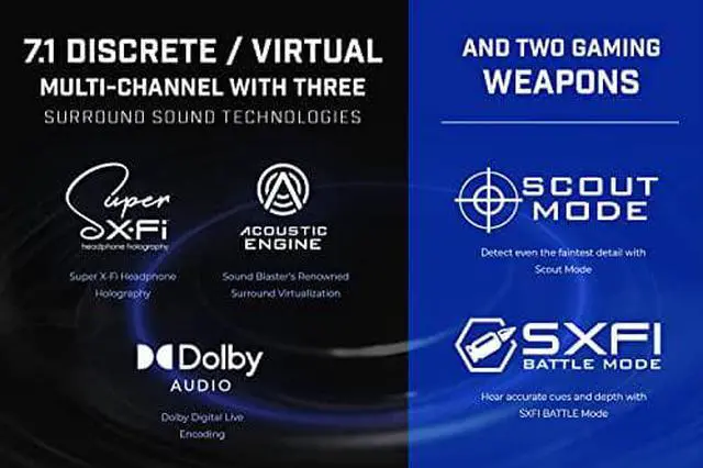 7.1 DISCRETE SURROUND WITH SUPER X-FI AND DOLBY DIGITAL LIVE - Supports up to 7.1 discrete and virtual surround with three types of surround sound delivery: 1. Super X-Fi technology that recreates the listening experience of a multi-speaker system in headphone 2. Sound Blaster Surround Virtualizations famed surround processing that is driven by algorithms that are capable of optimizing spatial information of incoming audio for a complete and immersive auditory experience 3. Dolby Digital Live