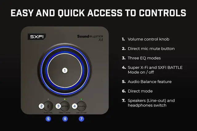 EASY ACCESS TO ALL CONTROLS - Pick between three EQ modes or re-program them, and save your settings on the device. There are also the Direct Mic Mute, Direct Mode, Super X-Fi and SXFI BATTLE Mode on/off buttons, as well as a speaker (Line-out) and headphones switch button. After a one-time setup, instantly adjust the volume levels between two audio sources (SPDIF / Optical / USB) with the Audio Balance feature via the volume knob, perfect for communicating with music on