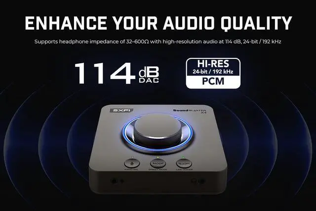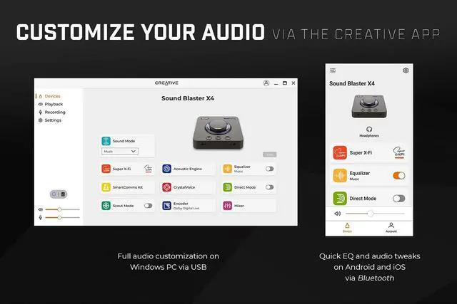 GAME AND HEAR YOUR WAY Choose between SXFI BATTLE Mode or Scout and get to winning your FPS game. Configure each element of your audio settings or switch them off completely via the Creative app. Access the full range of audio adjustments via the PC app, or make quick adjustments to your EQ settings from your phone. All these are powered by our Sound Blasters audio promise with 114 dB audio clarity and hi-res 192 kHz/24-bit playback