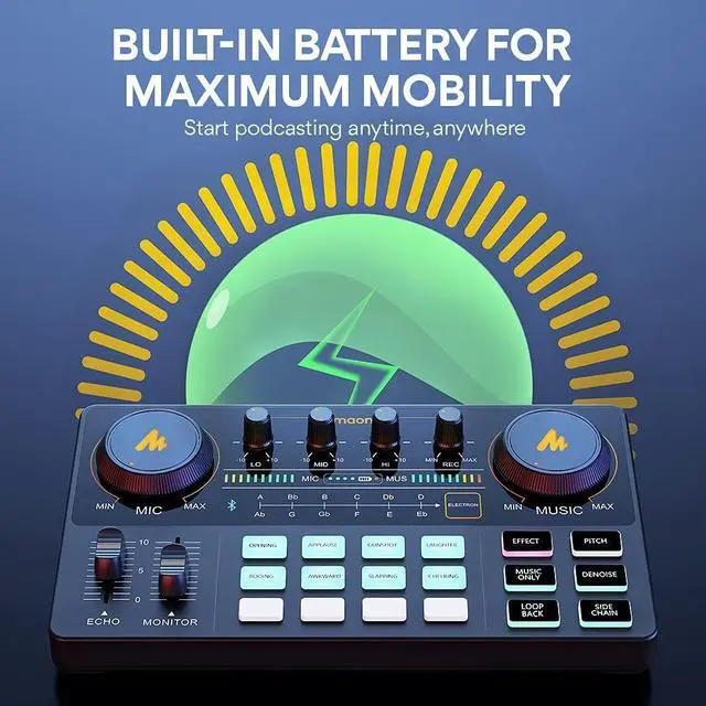 [SPECIAL EFFECTS]: Four user recordable, eight Built-in special sound pads, and various adjustments available for your creation. Fixed audio effects like APPLAUSE, LAUGHTER, CHEERING... Note please record your own audio effects you like to audio interface according to the instructions.