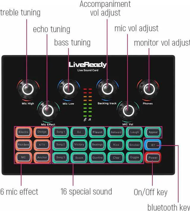 16 special sound effects, 6 microphone effect modes, 12 electronic sounds (no debugging,