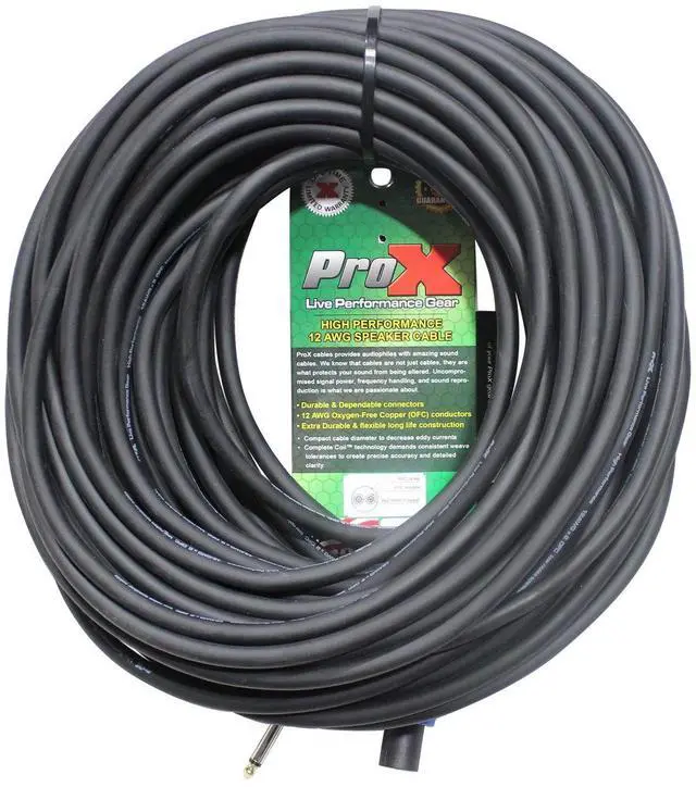 Find unparalleled audio connectivity with the ProX XC-SQ100 High Performance Speaker Cable, a quintessential choice for professional audio experts and enthusiasts alike. This robust 100-foot cable ensures a seamless connection between speakers with a 1/4" TS-M output and devices equipped with SpeakOn inputs, making it an indispensable tool for live sound, studio, and sound reinforcement applications. Crafted with 12 AWG Oxygen-Free Copper (OFC) conductors, the XC-SQ100 guarantees superior signal transfer, minimizing resistance and preserving the clarity and integrity of your audio signal over long distances. The high-quality construction of ProX cables reflects a commitment to excellence, ensuring each connection maintains optimal performance, whether for instruments, speakers, RCA, DMX, or power cables.