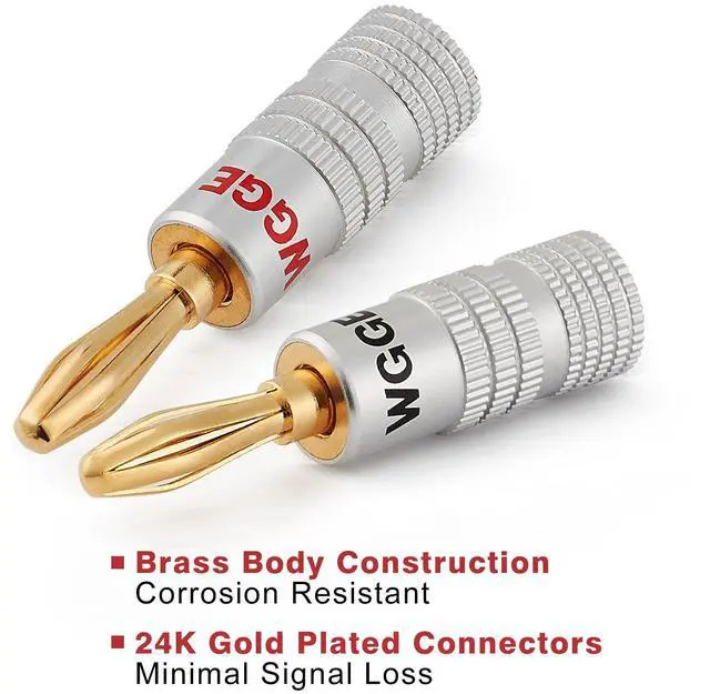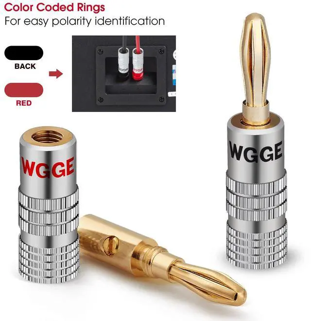 WGGE Banana Plugs Audio Jack Connector, 24k Gold Dual Screw Lock Speaker Connector for a lifetime of use, with a crystal clear signal. Isolates wires which keep them from shorting out and the two set screws keep the wire connection secure.