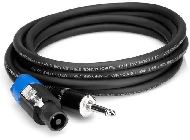 The 20' Neutrik Speakon to 1/4" Phone Male Speaker Cable is a professional-grade audio essential, designed to deliver a pristine and uninterrupted signal flow to non-powered speakers or monitors. Crafted with durability in mind, this robust cable features a 14 AWG gauge and is equipped with two conductors, ensuring high-quality sound transmission and reliability for live performances, studio sessions, and audio installations. Encased in a sturdy, round black jacket, this cable is built to withstand the rigors of frequent use and handling, making it an ideal choice for musicians, sound engineers, and audio professionals who demand both excellence and resilience in their audio equipment.