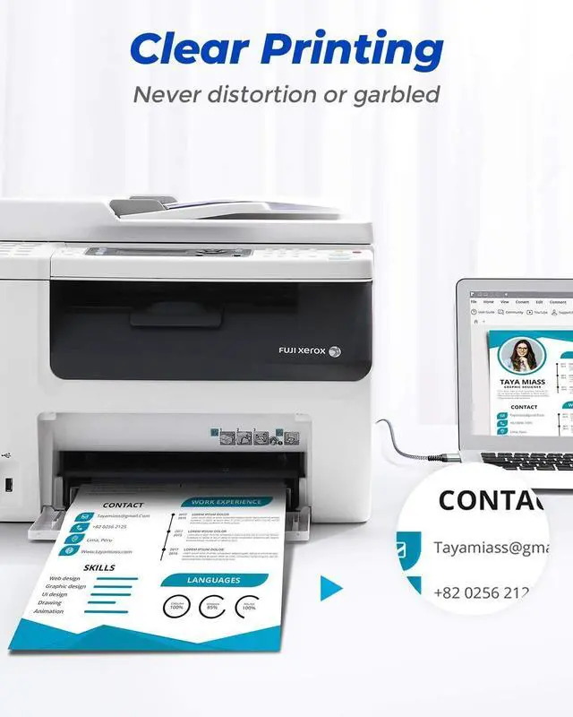: 100% GOLD-PLATED CONNECTORSThis USB printer cable features anti-oxidation, high-purity copper wire with enhanced shielding, and a higher conductor count for improved durability. Its 100% gold-plated connectors deliver exceptional signal transmission, minimizing EMI/RFI interference for stable, clear printing results. With plug-and-play functionality, theres no need for driver installations or cable orientation adjustmentsjust fast, hassle-free performance every time.